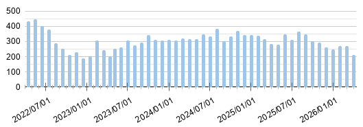 2025年は300DL前後で推移していました。2026年に入ってからは300DLを下回る月が続いており、平均のダウンロード数が少し下がっていますね。
