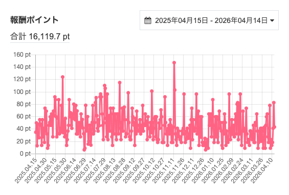 直近1年分の日ごとの変化は、下のグラフで確認できます。(ポイント=DL数ではありませんが、参考に。)